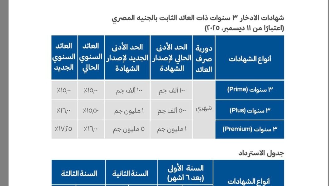 كما قام البنك برفع العائد على شرائحه الأخرى؛ حيث أصبح العائد على “شهادة 3 سنوات Plus” هو 16.00% سنوياً بحد أدنى مليون جنيه للإصدار. في حين وصل العائد على “شهادة 3 سنوات Prime” إلى 15.50% سنوياً بحد أدنى 100 ألف جنيه للإصدار.