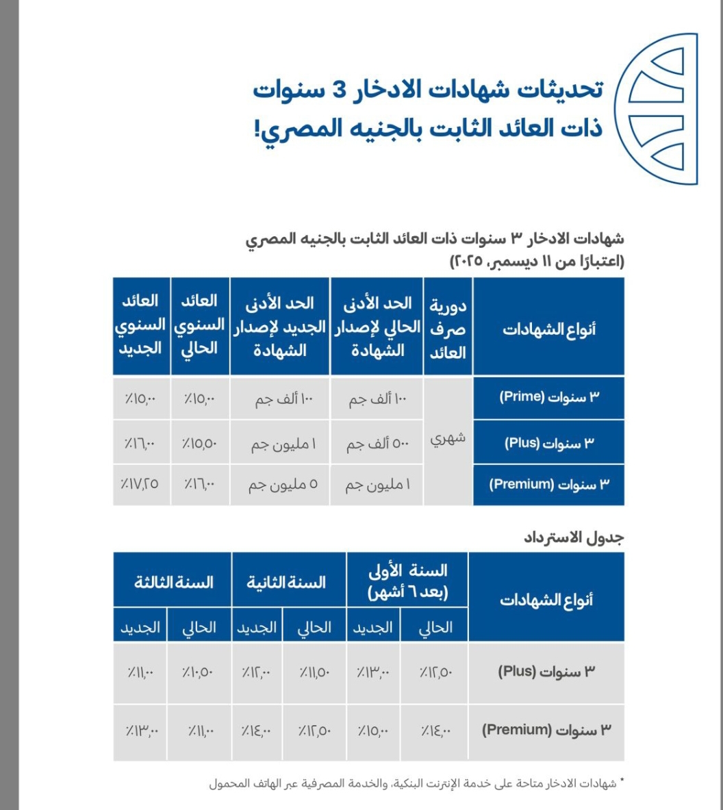 وشملت التحديثات طرح شريحة جديدة ذات عائد مرتفع، حيث أطلق البنك “شهادة 3 سنوات Premium” بعائد سنوي ثابت بلغ 17.25%. ويتم صرف هذا العائد بشكل شهري. ويتطلب إصدار هذه الشهادة حداً أدنى للشراء يبلغ 5 مليون جنيه.