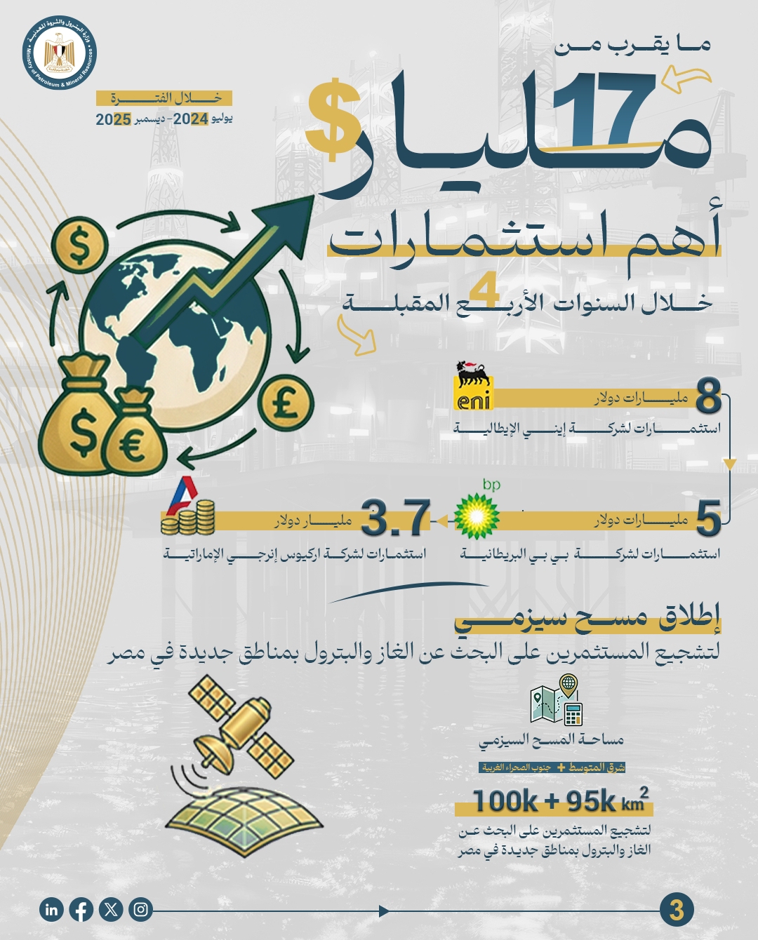 كما تم توقيع 33 اتفاقية جديدة للبحث عن البترول والغاز، باستثمارات حدها الأدنى 1.6 مليار دولار، إلى جانب طرح نحو 70 فرصة استثمارية جديدة في مناطق البحر المتوسط والأحمر والصحراء الغربية وخليج السويس والدلتا.