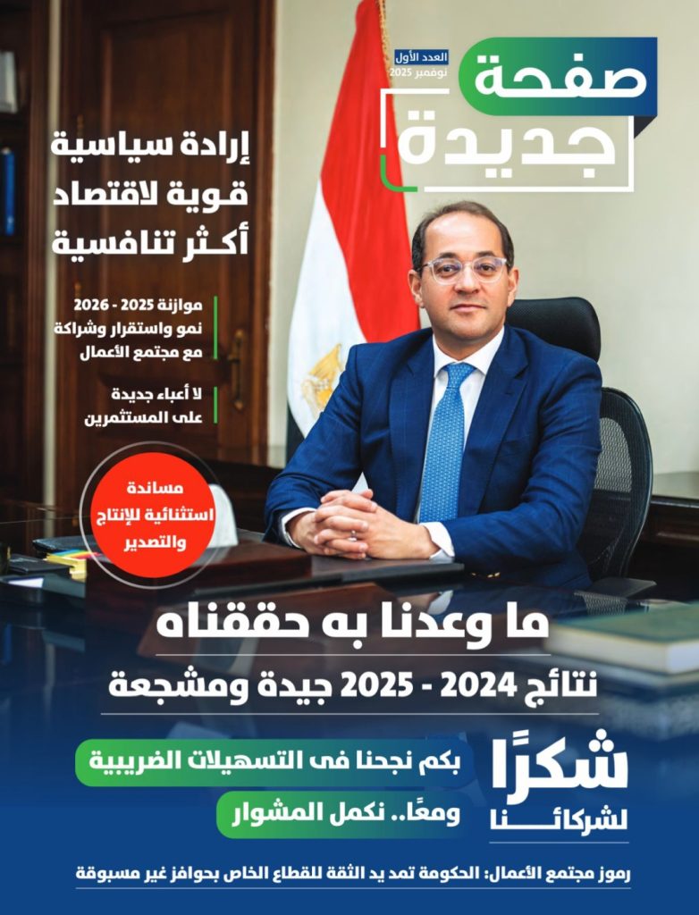 وجاءت مجلة «صفحة جديدة»، التي أعدتها الإدارة العامة للمكتب الإعلامي والمتحدث الرسمي بوزارة المالية، لتوثق مسار الثقة والشراكة مع مجتمع الأعمال، وتسليط الضوء على أولويات السياسات المالية وأهدافها والنتائج المحققة، في إطار دعم مسار الإصلاح المالي والاقتصادي للدولة.