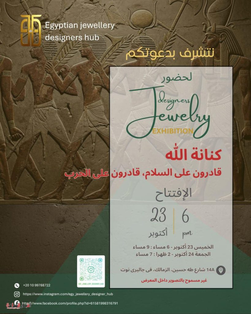 تستعد منصة مصممي الحلي والمجوهرات المصريين غدًا الخميس لافتتاح معرضها الفني الجديد تحت عنوان “كنانة الله.. قادرون على السلام، قادرون على الحرب”، وذلك في تمام السادسة مساءً بقاعة نوت بشارع طه حسين في الزمالك، ويستمر حتى يوم الجمعة الموافق 24 أكتوبر.
