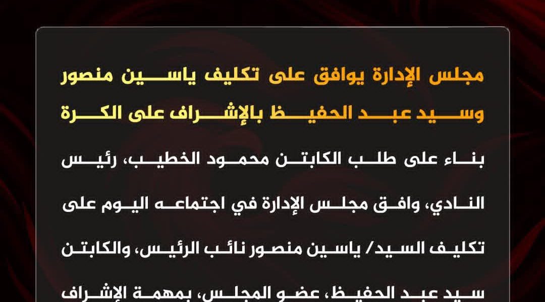 وافق مجلس إدارة النادي الأهلي، خلال اجتماعه الأخير، على تكليف ياسين منصور نائب رئيس النادي وسيد عبد الحفيظ عضو المجلس بمهمة الإشراف العام على شئون كرة القدم، بناءً على طلب محمود الخطيب رئيس النادي، مع منحهما كافة الصلاحيات والدعم الكامل من المجلس.