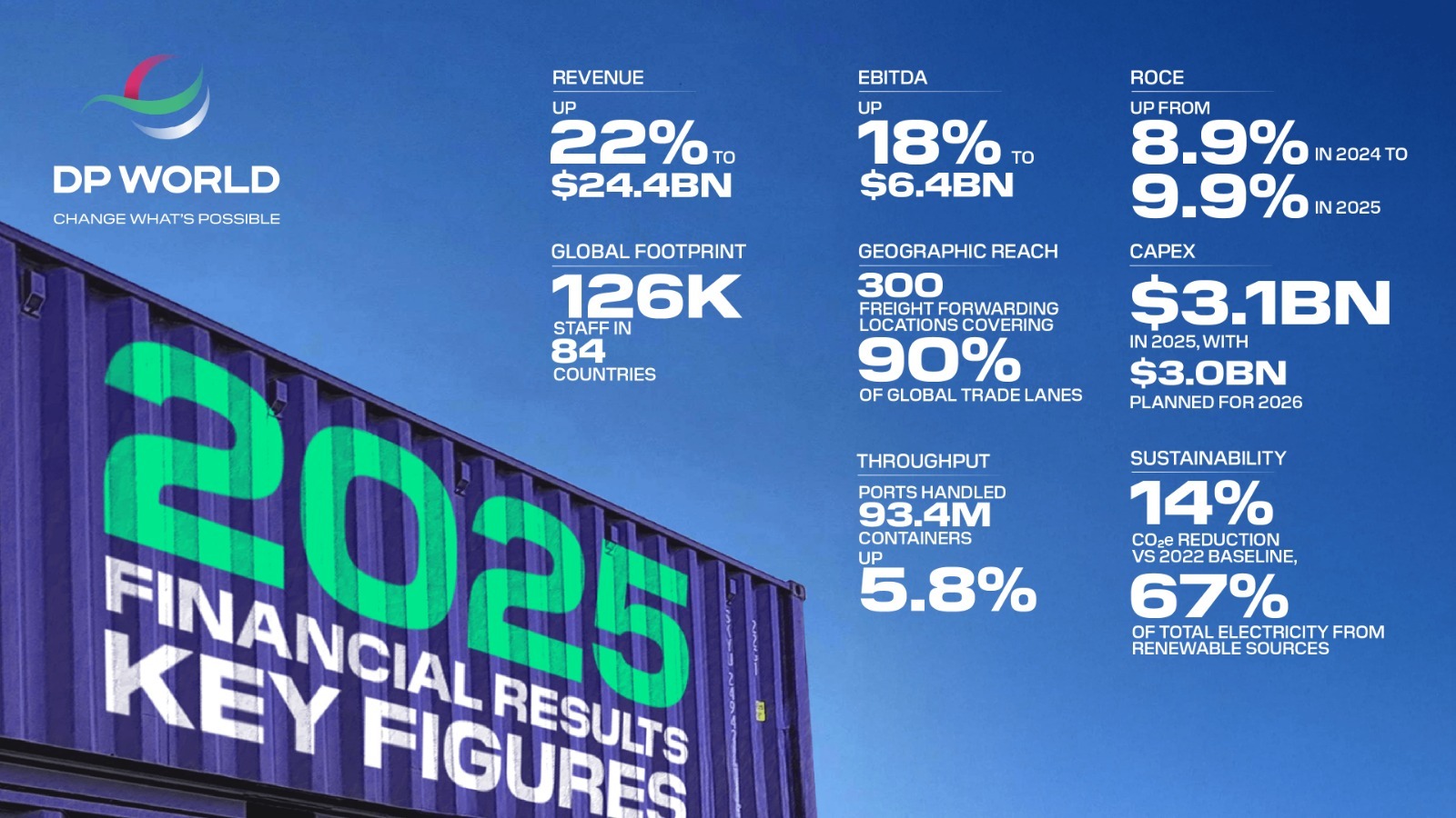 أعلنت مجموعة موانئ دبي العالمية “دي بي ورلد” عن تحقيق نتائج مالية قياسية لعام 2025، مع ارتفاع الإيرادات بنسبة 22% لتصل إلى 24.4 مليار دولار أمريكي، وارتفاع الأرباح قبل الفوائد والضرائب والإهلاك والاستهلاك بنسبة 18% لتسجل 6.4 مليار دولار بهامش 26.3%.