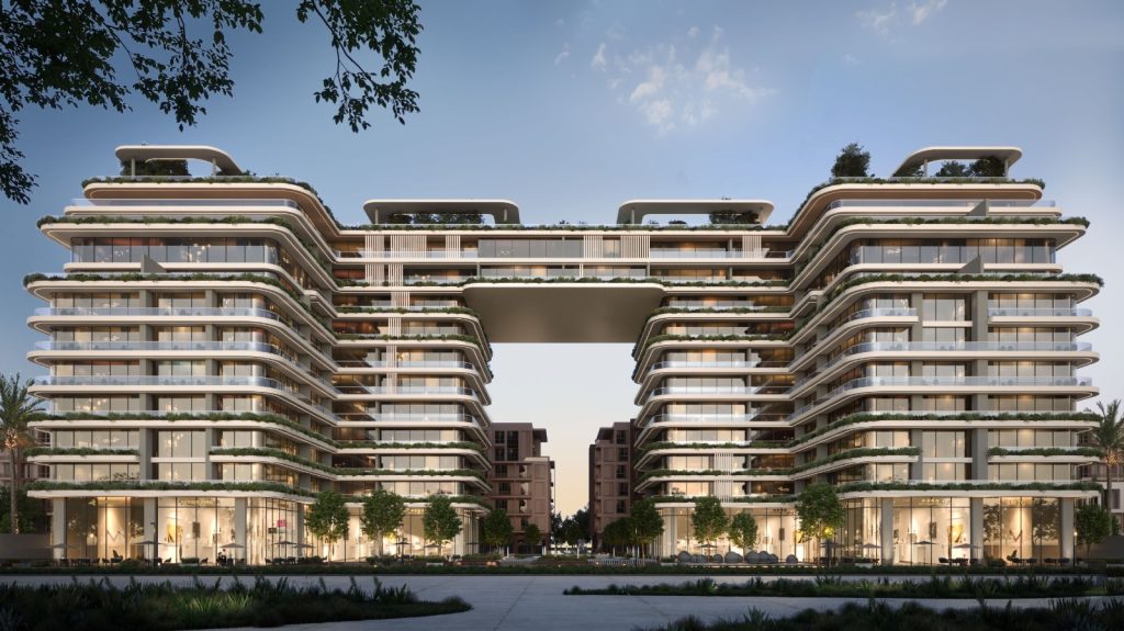 يتميّز البرج الأيقوني The Iconic Tower – بتصميم معماري فريد على شكل حرف U، ويتكوّن من برجين يضمان نحو 250 وحدة، متصلين بجسر علوي مميز يُشكّل بوابة معمارية بين المدينة والوادي الرئيسي في قلب مدينة السلطان هيثم.