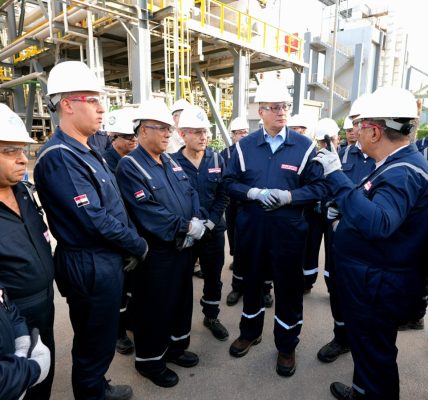 وفي ختام الجولة، التقى الوزير بفريق العمل المسؤول عن إدارة العمليات على الحفار، مثمنًا الجهود المبذولة لرفع كفاءة التشغيل وتحسين الأداء.